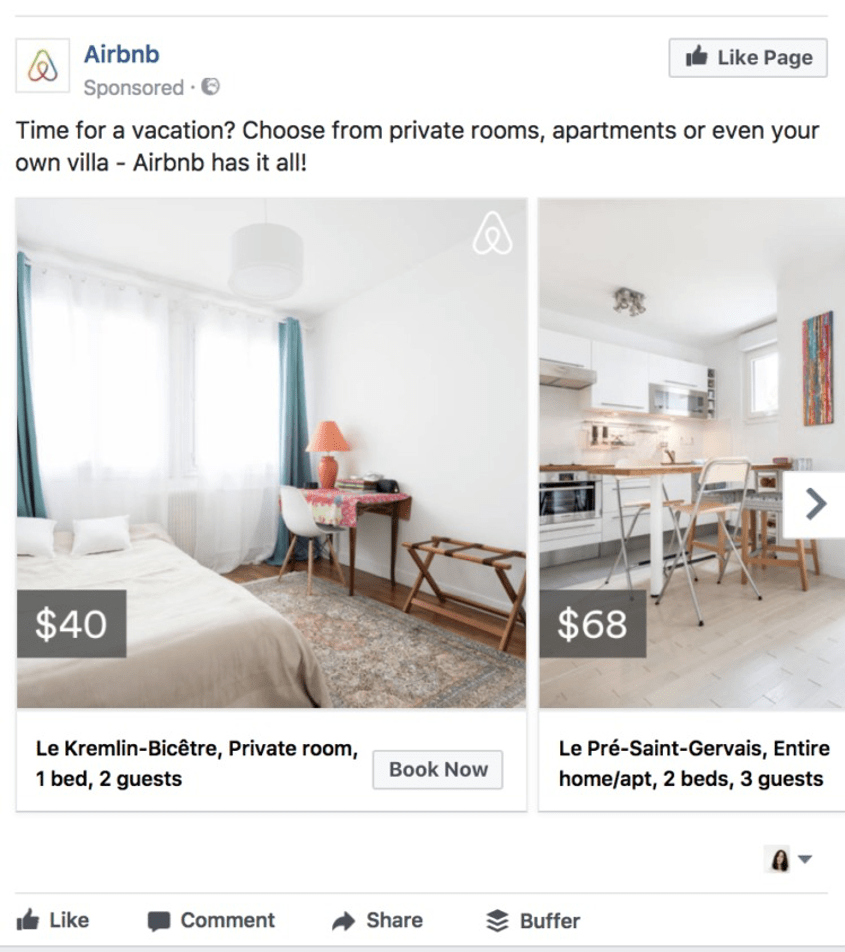 Airbnb is a great example when it comes to harnessing the power of Facebook ads successfully. The company focuses heavily on visual content, something that the Facebook algorithms favor and captures the visitor’s attention with remarketing ads that focus on laser-target deals for vacation spots.