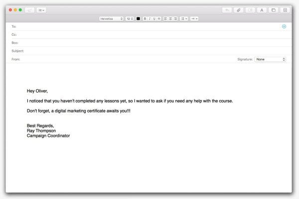 Here is another opportunity for a reminder-style email to push them to the next step. Lay it on thick with an enticing CTA required here. In this situation, it is commonly acceptable to set up multiple triggers in order to remind the user of your product/service.