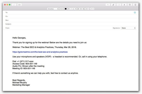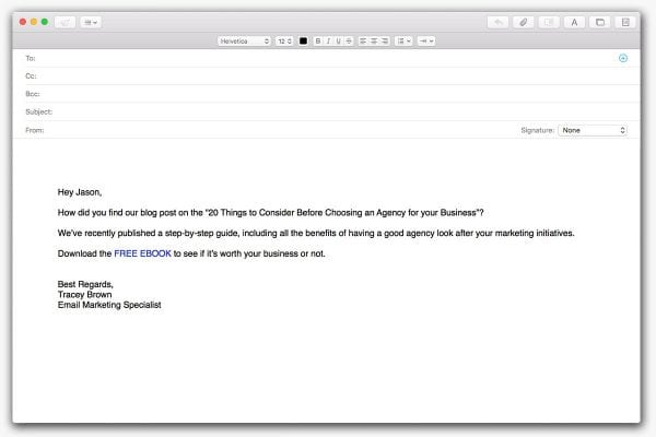 There’s a good opportunity to provide some follow-up content. This maybe additional information you have on a subject, or links to similar blogs of yours, or an e-book, etc. For example, you can set up a trigger in which the user visits one of your blog pages, and the user will receive an email accordingly.