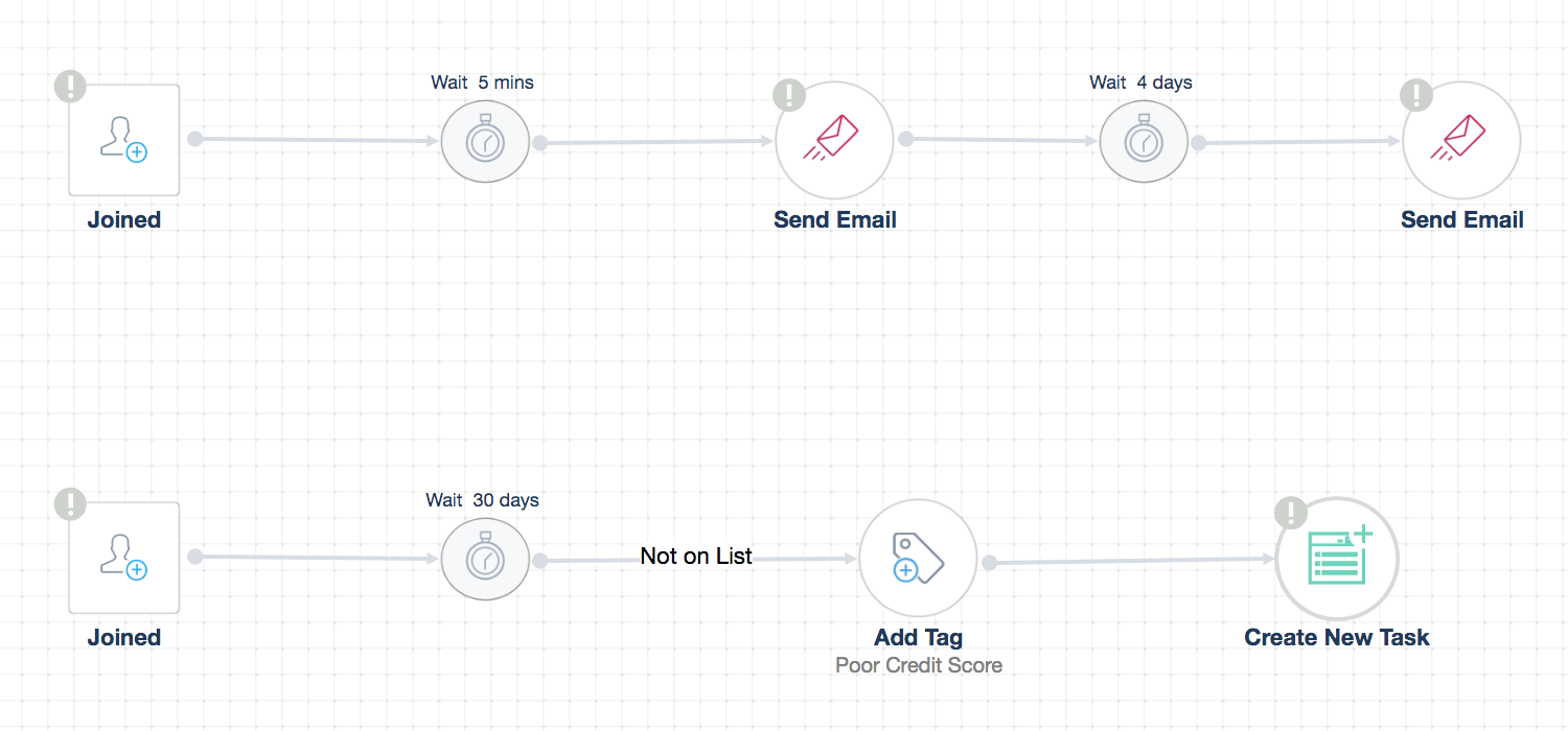 For those whose debts accumulate or took a lot time without paying their expenses, you can choose your main list of contacts adding a condition “Not on List – Good Credit Score” to exclude those who’ve already paid, allow a specific time delay according to your deadline’s policy then add a tag “Bad Credit Score”, then create a task for someone from your deal owners team to reach out for an attempt to improve their financial situation. This also enhances the relationship with your customers as you’re helping them solve their problems.