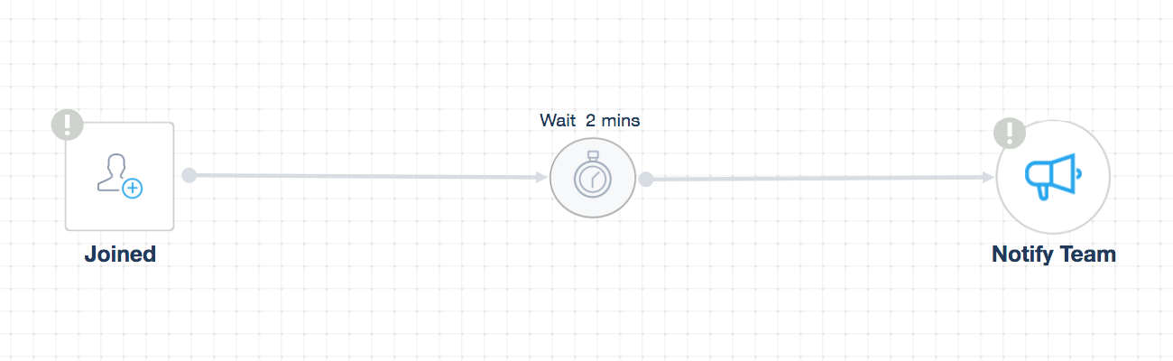 To create this workflow automation, you can create a trigger “Joined”, add a five-minute delay then notify the team.